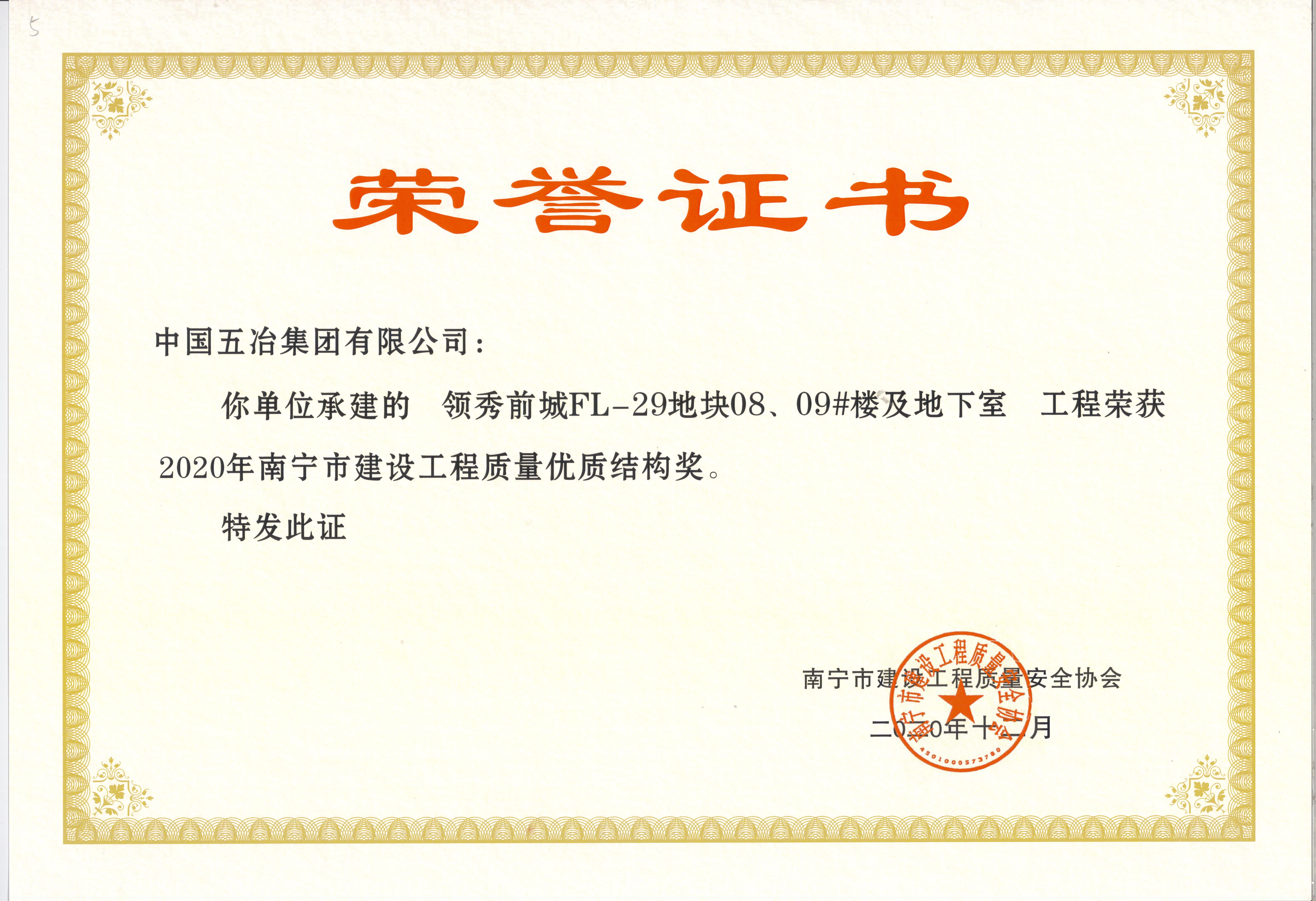 領(lǐng)秀前城FL-29地塊08、09#樓及地下室工程—2020年南寧市建設(shè)工程質(zhì)量?jī)?yōu)質(zhì)結(jié)構(gòu)獎(jiǎng)
