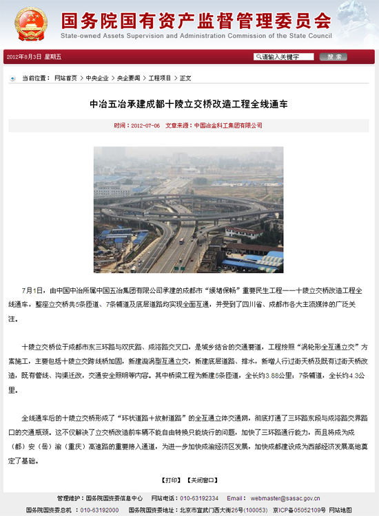 國資委報道:中冶五冶承建成都十陵立交橋改造工程全線通車