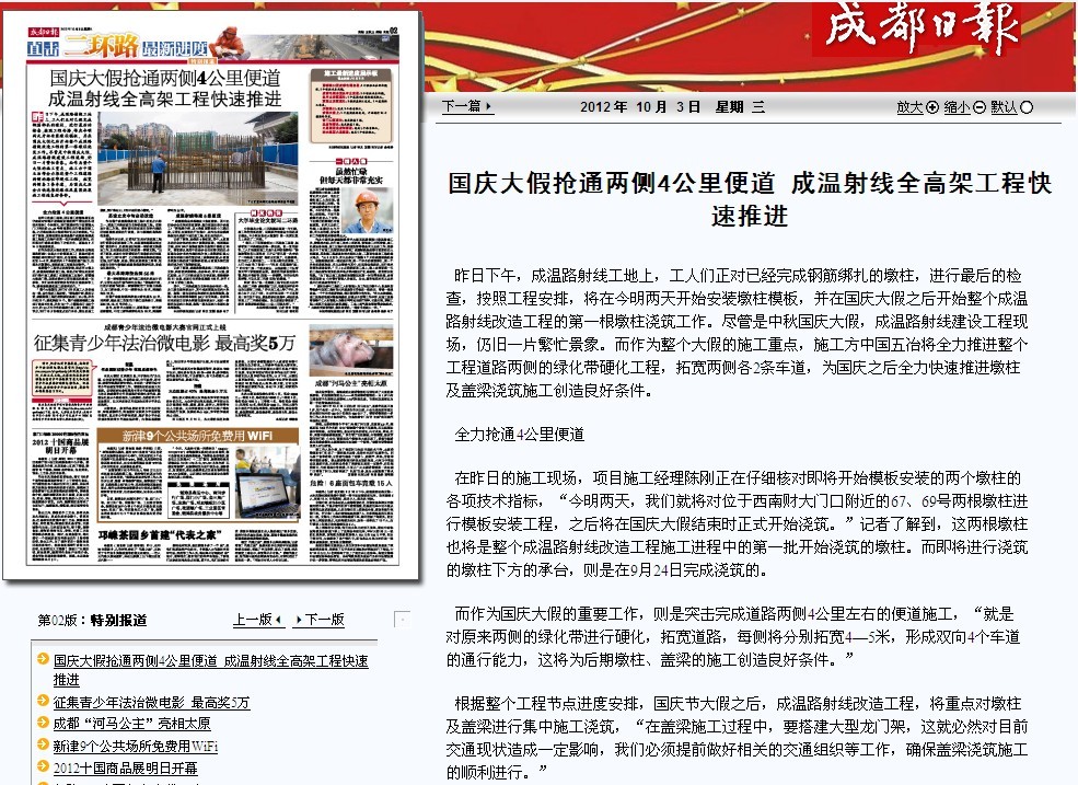 成都日報報道:國慶大假搶通兩側4公里便道 成溫射線全高架工程快速推進