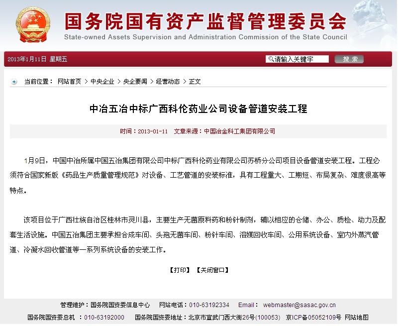 國資委報道:中冶五冶中標廣西科倫藥業公司設備管道安裝工程