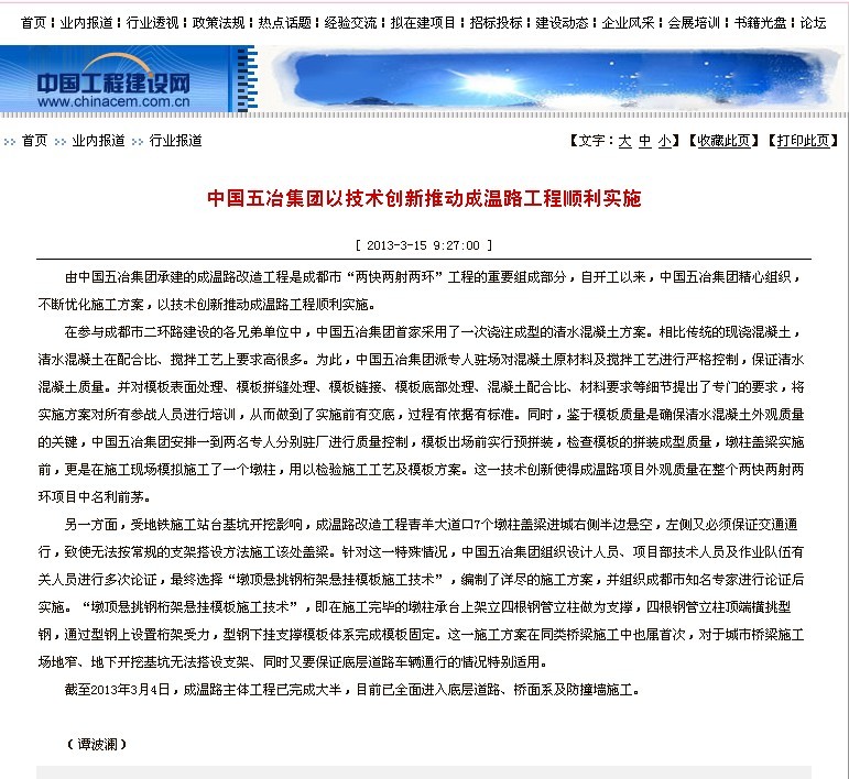 中國工程建設網報道:中國五冶集團以技術創新推動成溫路工程順利實施