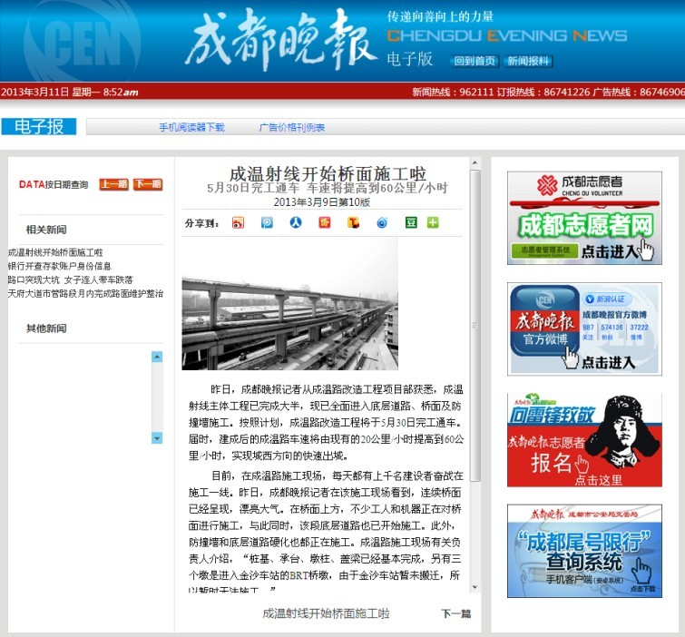 昨日,成都晚報記者從成溫路改造工程項目部獲悉,成溫射線主體工程已完成大半,現已全面進入底層道路、橋面及防撞墻施工。按照計劃,成溫路改造工程將于5月30日完工通車。屆時,建成后的成溫路車速將由現有的20公里/小時提高到60公里/小時,實現城西方向的快速出城。