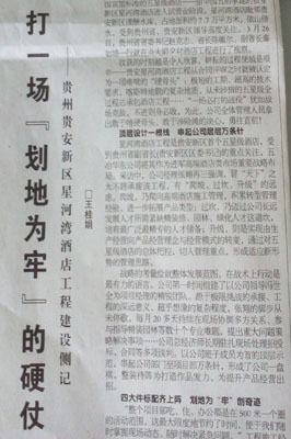 4月2日,建筑時報第3207期第六版以《打一場“劃地為牢”的硬仗》為題,從“頂層設計一根線,串起公司層層萬條針”、“四大件標配齊上陣,劃地為‘牢’創奇跡”、“在速度與轉型中演繹冰火之歌”三個層面對中國五冶承建的貴州貴安新區星河灣酒店的建設過程進行了如實報道。
