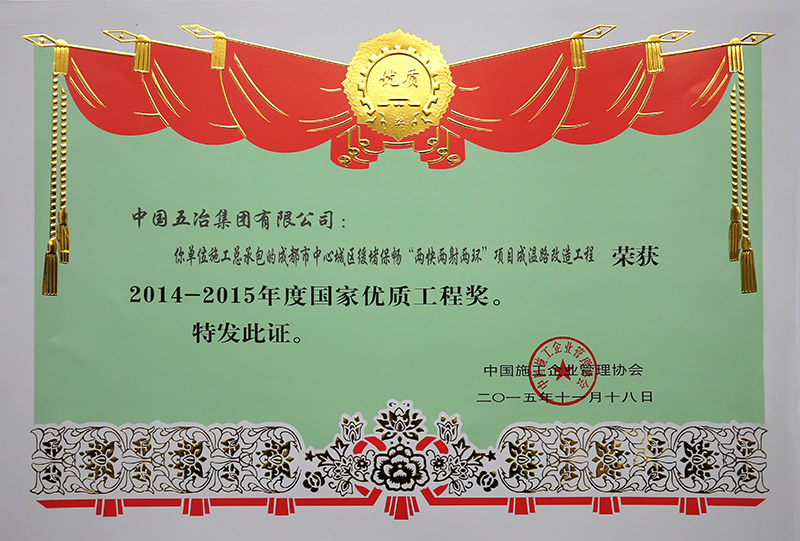 ????2015年12月18日,中國五冶集團成溫路改造工程榮獲2014-2015年度國家優質工程銀獎。