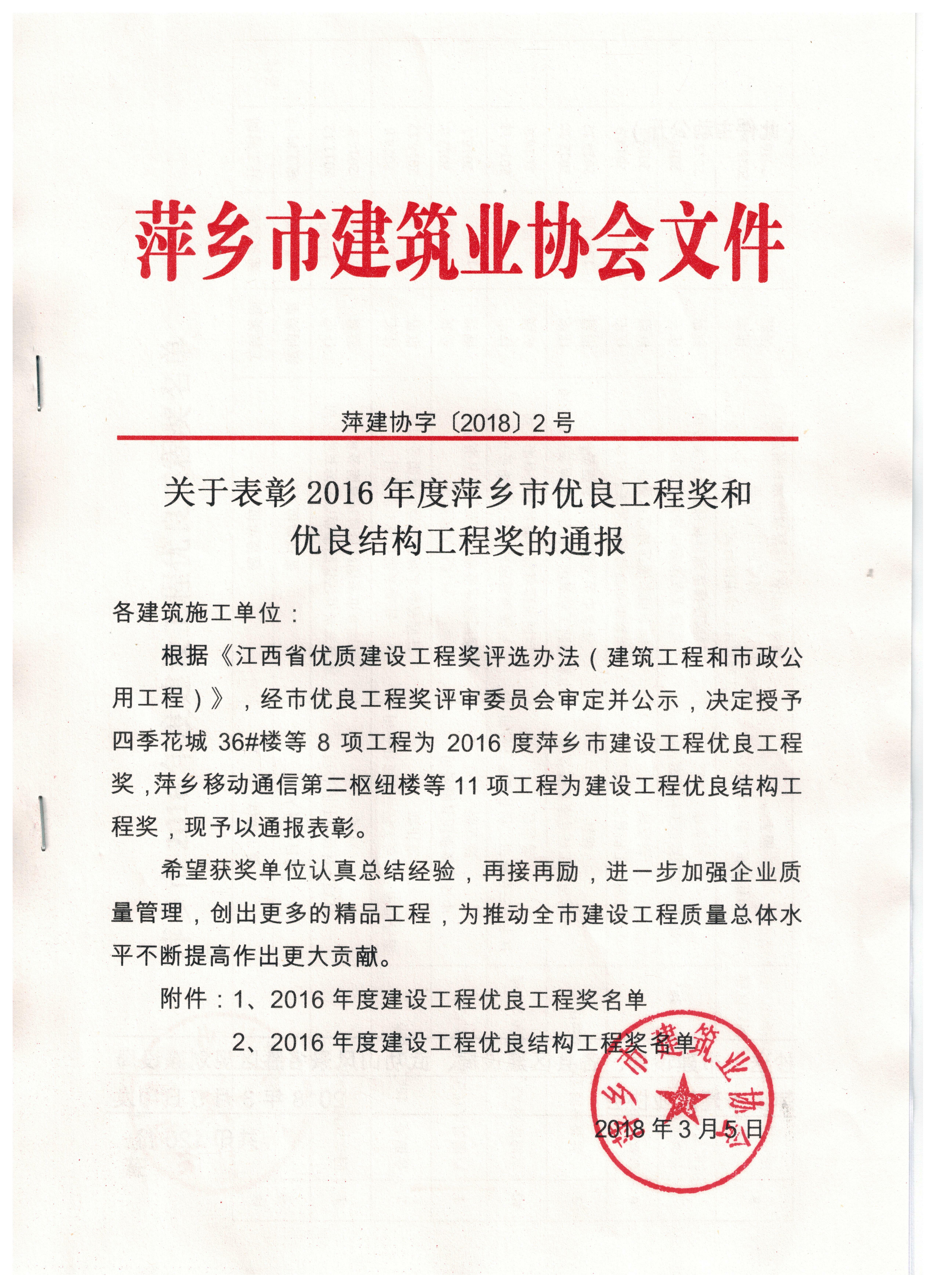匯恒小區1#-8#樓及地下室工程榮獲2016年度萍鄉市建設工程優良結構工程獎