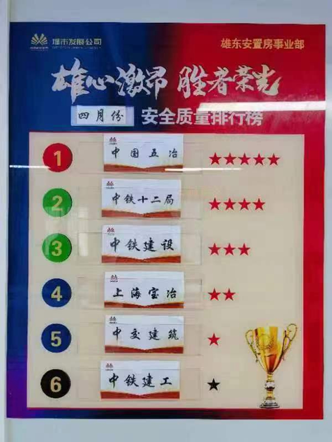 此項排名由雄安集團城市發(fā)展投資有限公司發(fā)起,以月度為周期,從安全質(zhì)量等五大維度對6家參與雄東B單元安置房項目建設的央企總包單位進行綜合考核。中國五冶集團憑借優(yōu)秀的項目管理能力和安全質(zhì)量水平,自2月份以來已連續(xù)3次榮膺履約考評第一佳績,項目4名管理人員連續(xù)2次摘得“安全質(zhì)量之星”“項目管理之星”榮譽稱號。