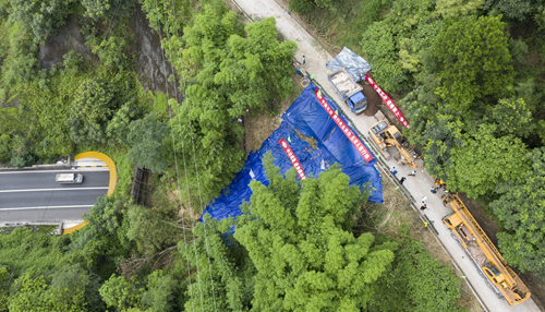 接到重慶市江北區(qū)規(guī)劃和自然資源局任務(wù)委托后,成勘公司立即集合精兵強(qiáng)將,連夜奔赴現(xiàn)場搶險。第一時間到達(dá)指定位置后,搶險項目團(tuán)隊立即在滑塌區(qū)周邊采取斷道措施,設(shè)置警戒標(biāo)志,確保行人安全,并對滑塌體表層的石塊及樹木進(jìn)行細(xì)致清理,疏通滑坡體后側(cè)公路長約60米的水溝,同時在現(xiàn)有公路外側(cè)修筑5厘米高的混凝土擋塊,防止地表水從公路內(nèi)側(cè)溢出到滑體后側(cè),利用防水布將現(xiàn)有滑塌體及其臨近一定的區(qū)域進(jìn)行遮蓋,防止雨水進(jìn)入誘發(fā)二次滑塌。